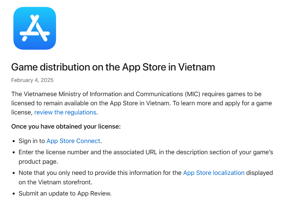 The Vietnamese Ministry of Information and Communications now mandates a local game license for all games on the App Store in Vietnam (Apple News: Link ), Google Play: Link).