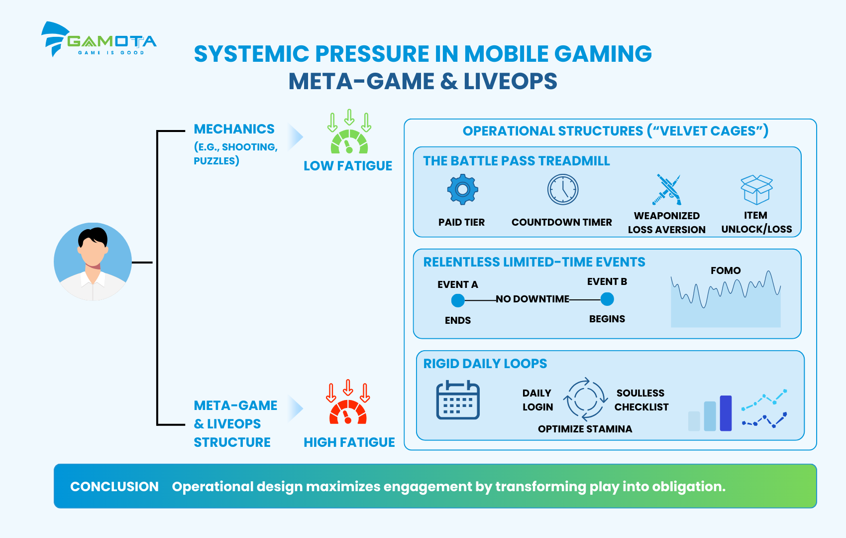 Nếu phân tích phản hồi của người dùng, bạn sẽ thấy người chơi hiếm khi phàn nàn rằng việc bắn súng, giải đố hay xếp kim cương làm họ mệt mỏi. Sự cạn kiệt năng lượng thực chất bắt nguồn từ Meta-game và cấu trúc LiveOps [4][5].