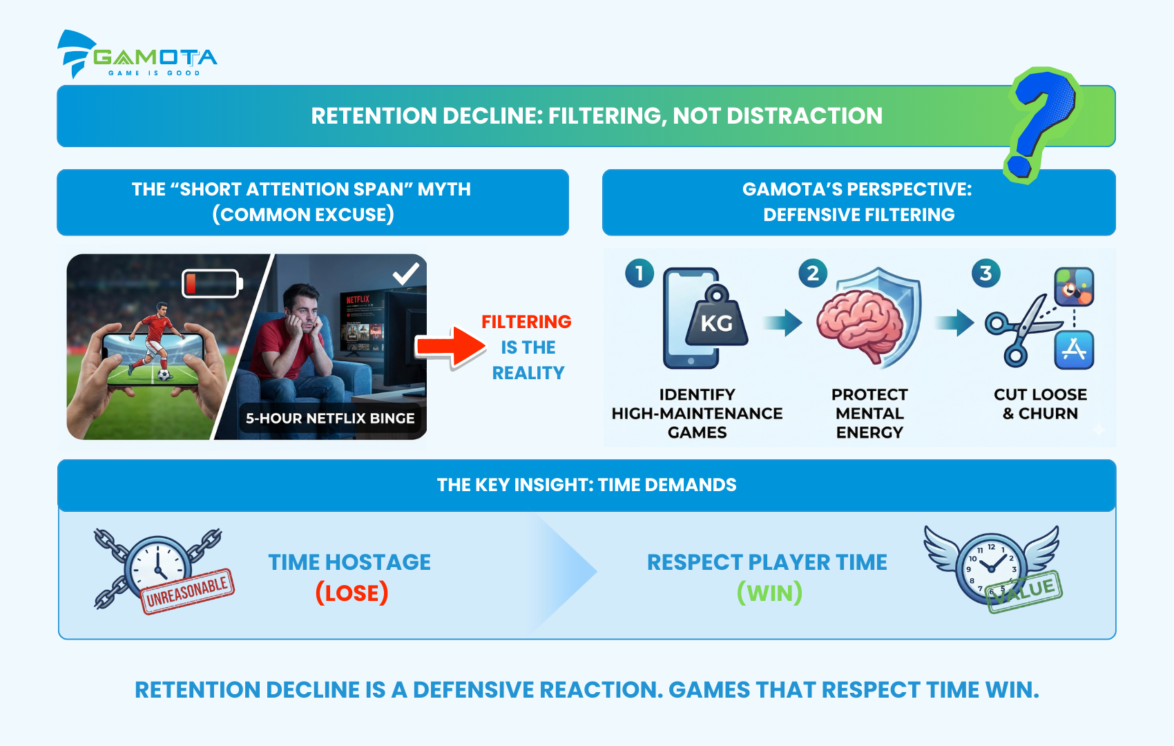 Sự sụt giảm trong tỷ lệ giữ chân không phải là dấu hiệu của sự xao nhãng; đó là phản ứng phòng vệ trước những đòi hỏi thời gian vô lý. Những tựa game biết tôn trọng thời gian của người chơi đang bắt đầu chiến thắng những tựa game cố gắng “bắt cóc” thời gian của họ.