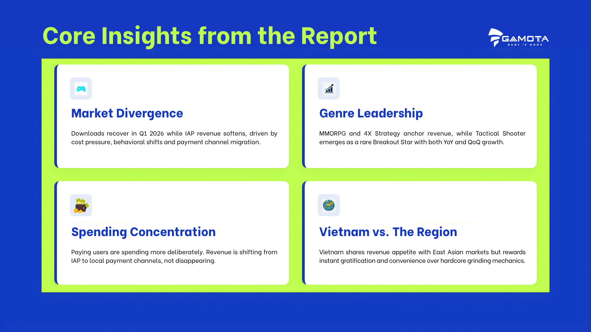 - Tổng quan thị trường Q1 2026: Phân tích xu hướng doanh thu IAP, lượt tải và các tín hiệu tăng trưởng đáng chú ý của thị trường game mobile Việt Nam trong quý đầu năm.