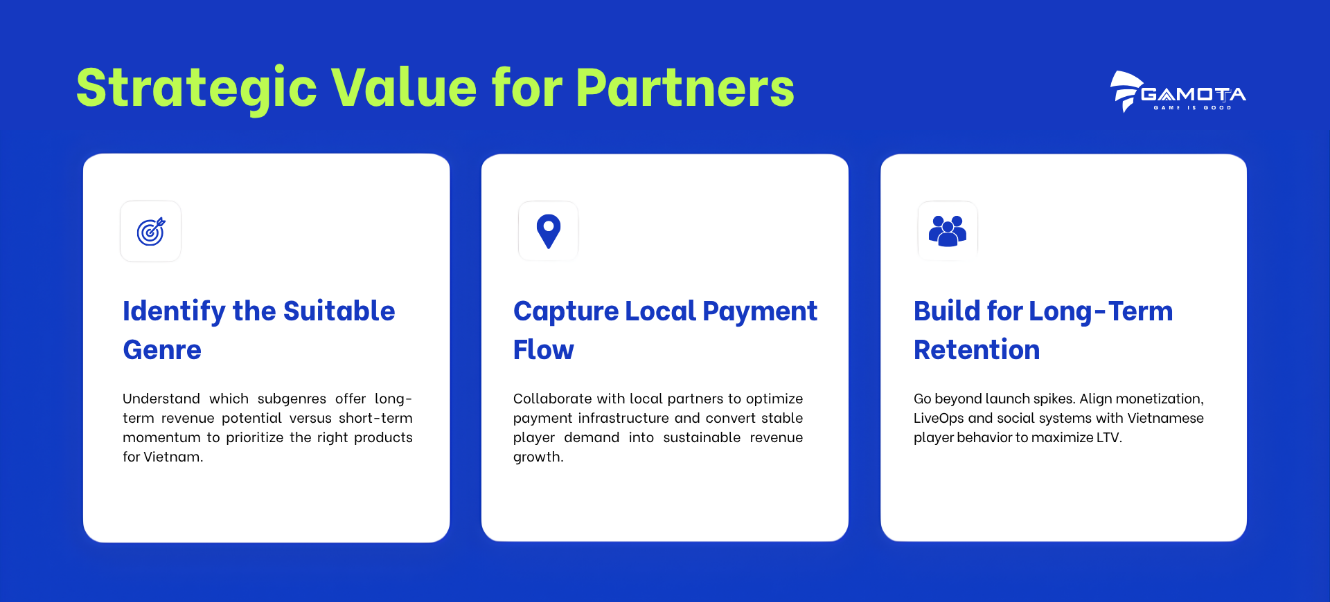 - So sánh thị trường Việt Nam với khu vực: Chỉ ra những điểm tương đồng trong khẩu vị game giữa Việt Nam và các thị trường lớn tại châu Á, đặc biệt ở các dòng game chiến thuật và cạnh tranh cao.