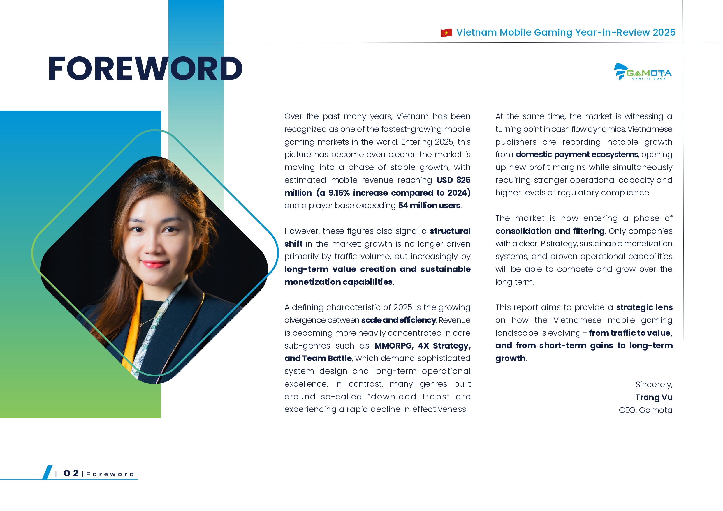 Bà Trang Vũ, CEO Gamota chia sẻ trong báo cáo: “Thị trường hiện nay không còn ưu tiên cho những mục tiêu ngắn hạn. Đây là lúc các nhà phát hành phải tập trung vào giá trị thực và khả năng sinh lời bền vững.”
