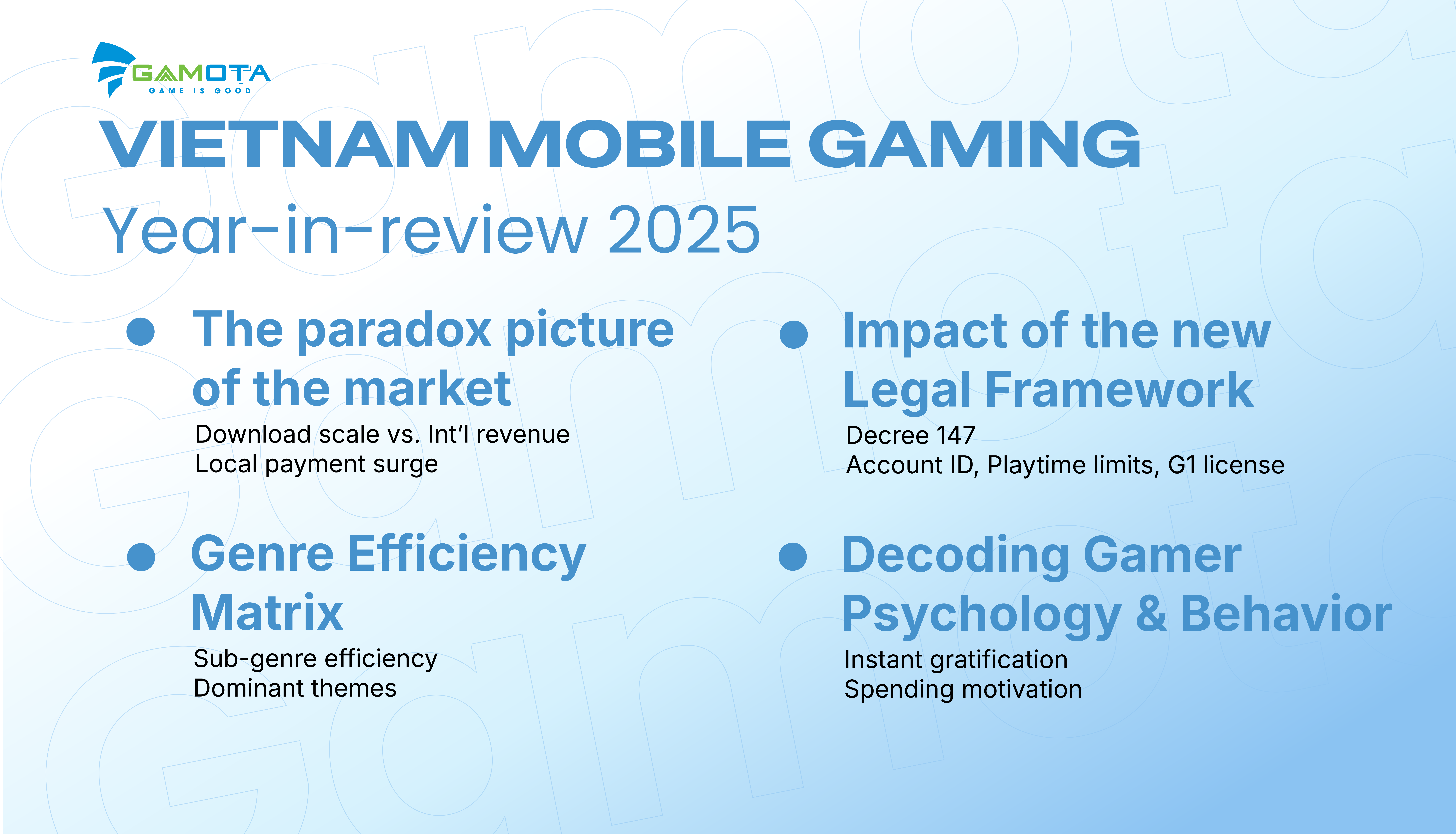 Năm 2025, thị trường trò chơi di động Việt Nam đang cho thấy một khoảng cách đáng kể giữa số lượng người chơi và kết quả kinh doanh thực tế. Gamota chính thức phát hành báo cáo “Vietnam Mobile Gaming Year-in-Review 2025” nhằm lý giải nguyên nhân ngành công nghiệp này đang chuyển dịch mạnh mẽ từ lượng sang chất.