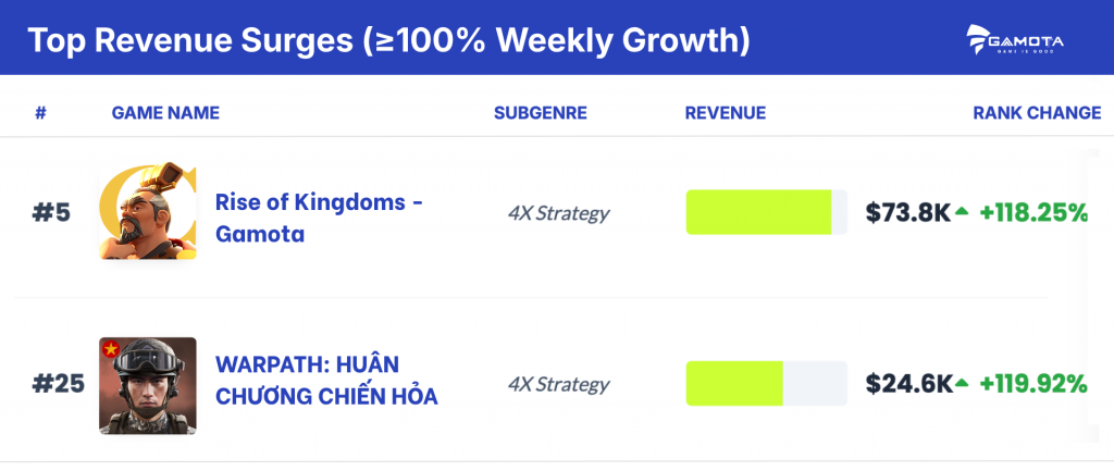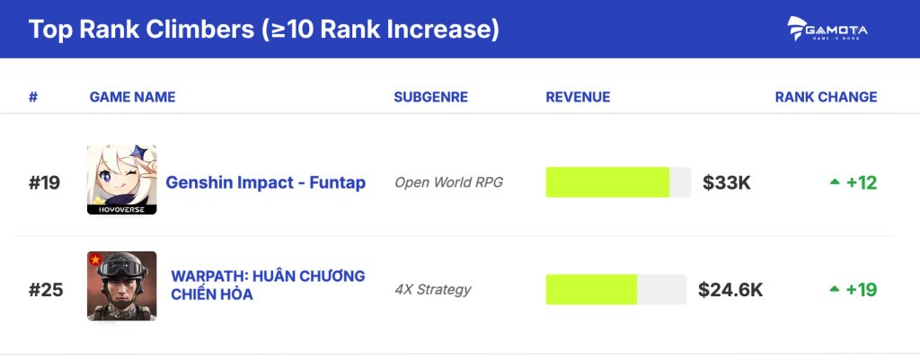 - Một số tựa game ghi nhận tăng trưởng đồng thời về thứ hạng và doanh thu, tiêu biểu như WARPATH: Huân Chương Chiến Hỏa, thay vì chỉ biến động ở một chỉ số.