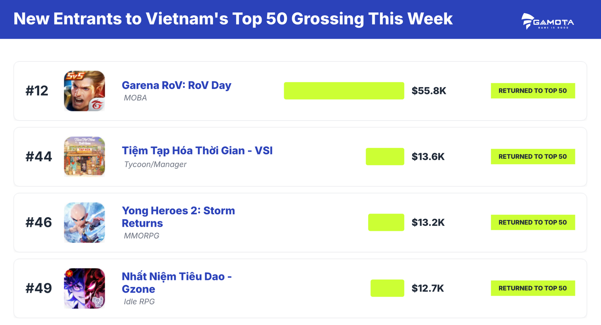 Điển hình, Garena RoV: RoV Day, tựa game đã ra mắt khoảng 9 năm tại Việt Nam, cũng quay trở lại bảng xếp hạng trong tuần này, trùng với thời điểm triển khai một số nội dung mới như các skin Krixi Kimono, Triệu Vân Chiến Thần Vô Song và bộ skin chủ đề Tiệc Bãi Biển (Astrid, Mina, Tel’Annas).